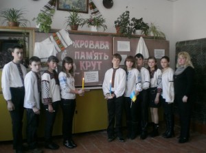 Виховним уроком для учнів школи села став позакласний захід «Кривава пам’ять про Крути», яку провели вчитель історії Марія Богданівна Олійник та учні 8 класу. Відбулась також загальношкільна лінійка «На Аскольдовій могилі поховали їх», яку підготували учні 9 – А класу під керівництвом педагога-організатора Галини Миколаївни Лепкалюк. А шкільний бібліотекар Віра Володимирівна Глібчук ознайомила учнів з тематичною літературою.