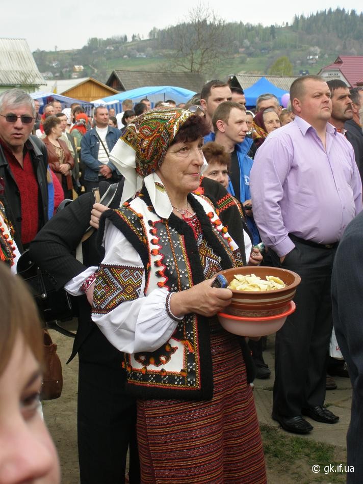 Ближче до самого центру вишикувались у довжелезні ряди різноманітні автівки, а ще ближче до центральної святкової сцени, де вже грайливо акомпанували гуцульські музики, – простяглися по обидва боки дороги багаті прилавки з дерев’яними, керамічними і кованими виробами, вишитими рушниками і сорочками тощо. Серед усіх цих прикрас, сувенірів і пацьоркованих вишиванок на ярмарку народних ремесел не можливо було оминути поглядом і найкращі традиційні гуцульські смаколики – сирні коники. А їх тут було, як то кажуть, від кольору до вибору, різних розмірів, навіть у кілька разів більших за долоню. Кожен охочий також міг купити космацькі писанки, поласувати будзом, банушем з бринзою чи варениками.