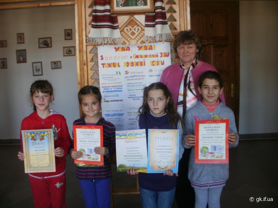 Насиченим і плідним був тиждень початкової освіти. Діти з нетерпінням чекали понеділка, бо саме того дня на лінійці урочисто проводили його підсумки, відбулося нагородження переможців. Цього року ними були Максим Пасічняк (4 клас) — капітан команди «Рахівник» у математичному КВК, учениця 2 класу Анастасія Кумлик – конкурс «Кращий читець віршів про мову», Аліна Прокопів, учениця 4 класу — конкурс «Вгадай мелодію», учениця 3 класу Галина Григорчук — конкурс дитячих малюнків «Країна казкова – країна чудова».