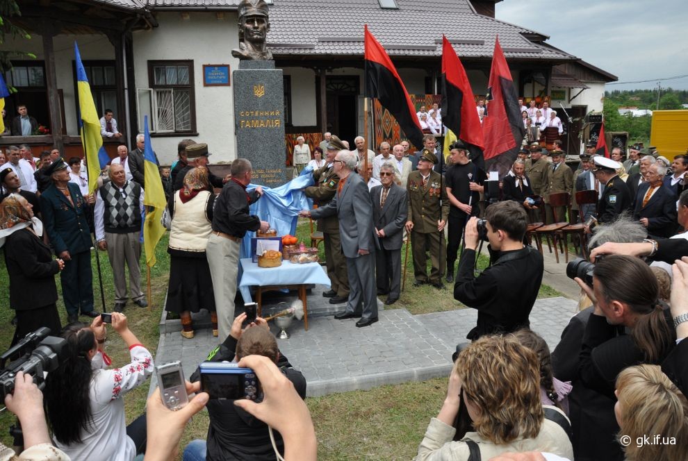 Погожого літнього дня, на Зелені свята, зібрались жителі села Стопчатів, навколишніх сіл, а також гості з Коломиї та Косова, Івано-Франківська та Києва, Нікополя та Львова, щоб відкрити пам’ятник славному синові України, уродженцю села Стопчатів Василю Скригунцю – сотенному Української Повстанської Армії «Гамалії». Ідея спорудження цього постаменту належить нашому землякові, Герою України, відомому українському поетові Дмитрові Павличку, племінницям сотенного «Гамалії» Парасці і Анні Скригунець, яких називають гамалійками, та ще цілому ряду небайдужих людей.